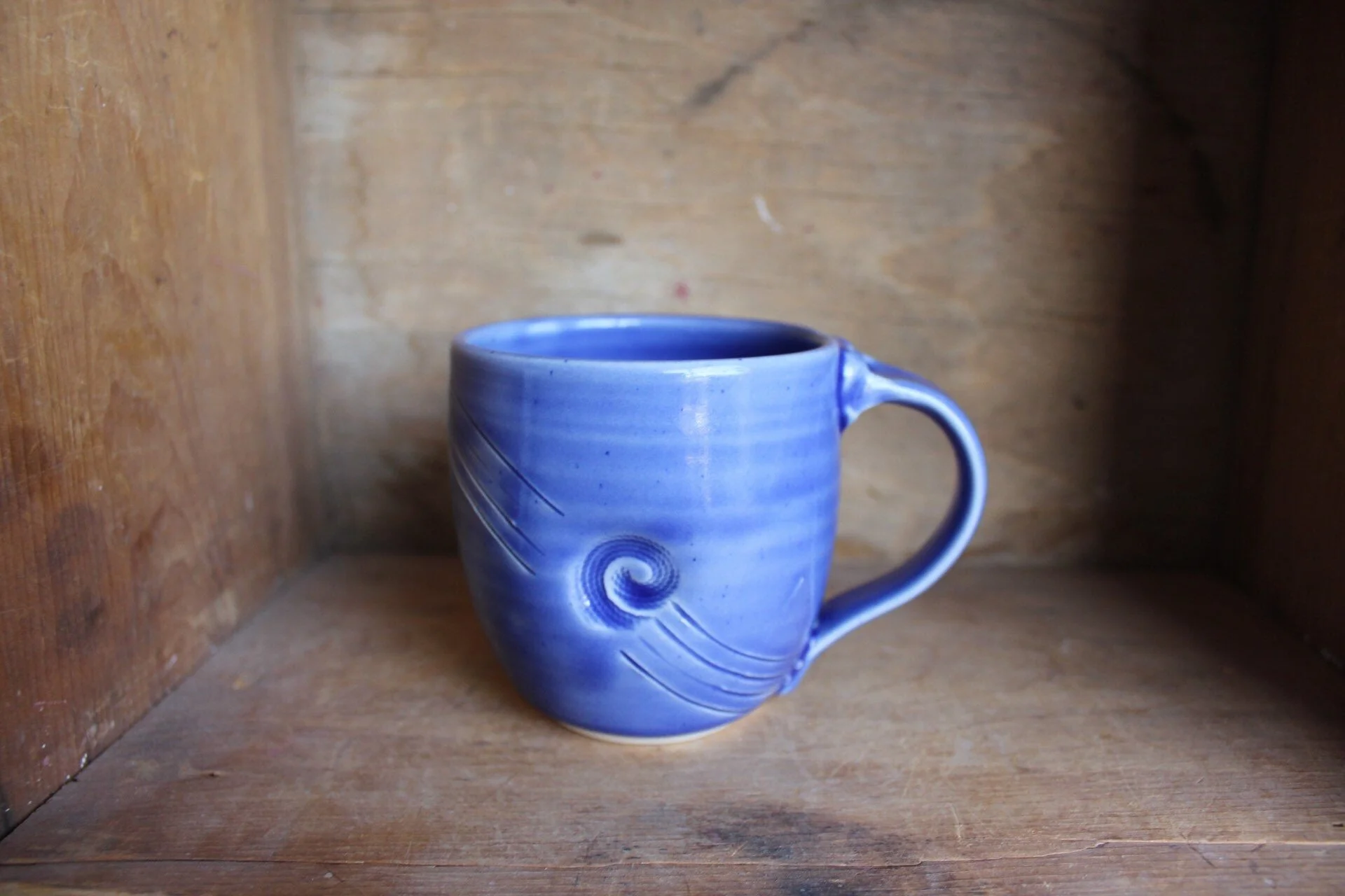 Hand thrown on the wheel by Ginette Arsenault then glazed in a cobalt blue glaze. This cup was kiln fired at 2000 degrees. It measures approx 3" tall x 3" wide and can by used as a mug or tea cup. It holds approx 8oz.